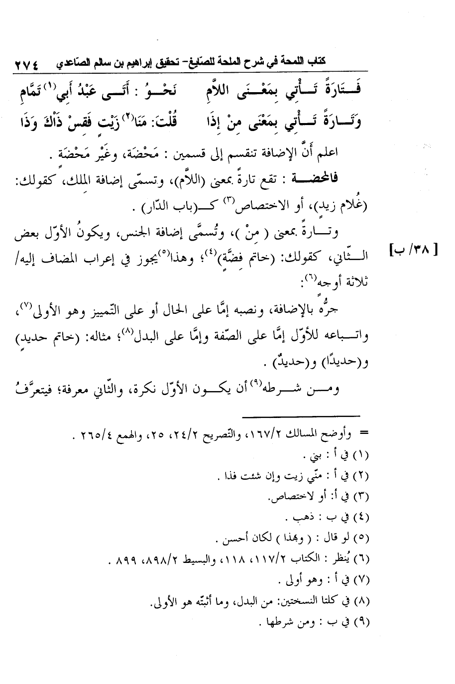 وتارةً بمعنى (مِنْ) ، وتُسمَّى إضافة الجنس، ويكونُ الأوّل بعض الثّاني، كقولك: (خاتم فِضَّةٍ) 4؛ وهذا5يجوز في إعراب المضاف إليه [38/ب] ثلاثة أوجهٍ6: