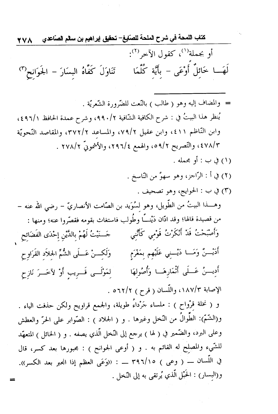 و (نخلة قِرْواح) : ملساء جَرْداءُ طويلة، والجمع قراويح ولكن حذفت الياء. و (الشّمّ) : الطِّوالُ من النّخل وغيرها. و (الجلاد) : الصّوابر على الحرّ والعطش وعلى البرد، والضّمير في (لها) يرجع إلى النّخل الّذي يصفه. و (الخائل) المتعهّد للشّيء والمصلِح له القائم به. و (أوعى الجوانح) : مجبورها بعد كسر، قال في اللّسان - (وعى) 15/396 -:"وَعَى العظم إذا انجبر بعد الكسر". و (البِسار) : الحَبْل الّذي يُرتقى به إلى النّخل.