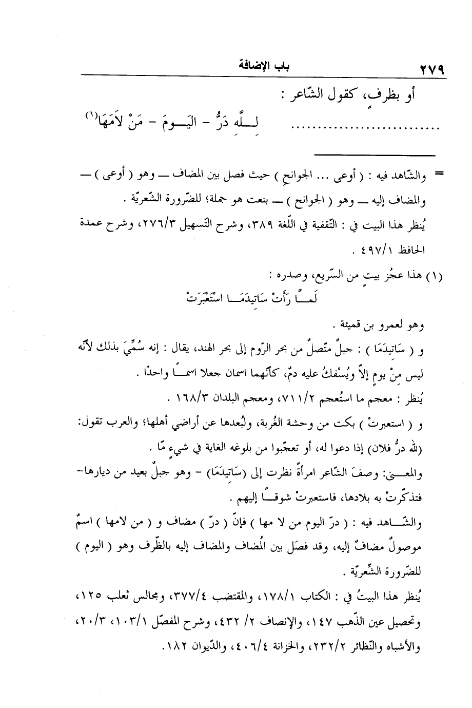 والشّاهد فيه: (درّ اليوم من لا مها) فإنّ (درّ) مضاف و (من لامها) اسمٌ موصولٌ مضافٌ إليه، وقد فصَل بين المُضاف والمضاف إليه بالظّرف وهو (اليوم) للضّرورة الشِّعريّة.