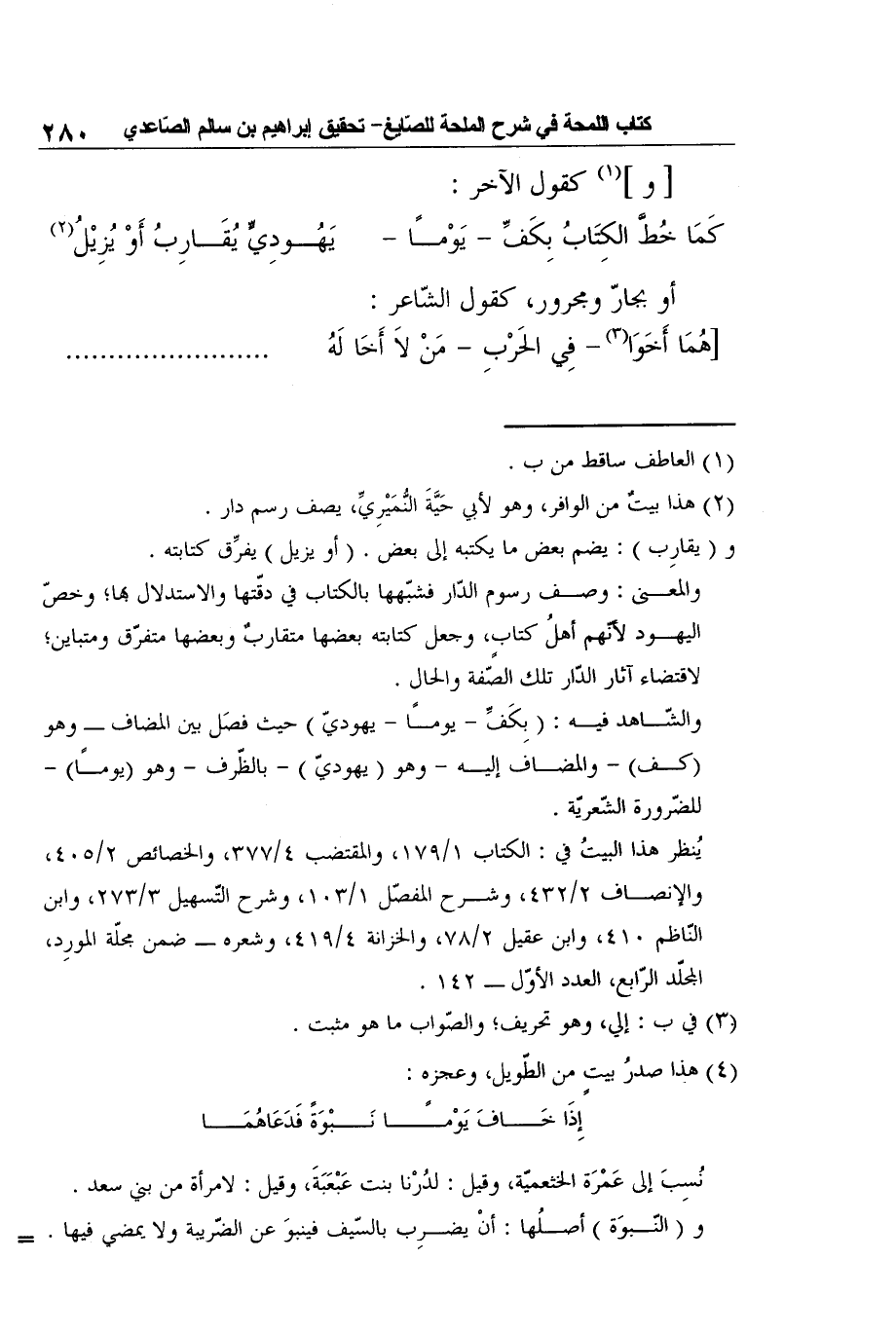والشّاهد فيه: (بِكَفِّ - يومًا - يهوديّ) حيث فصَل بين المضاف - وهو (كف) - والمضاف إليه - وهو (يهوديّ) - بالظّرف - وهو (يومًا) - للضّرورة الشّعريّة.