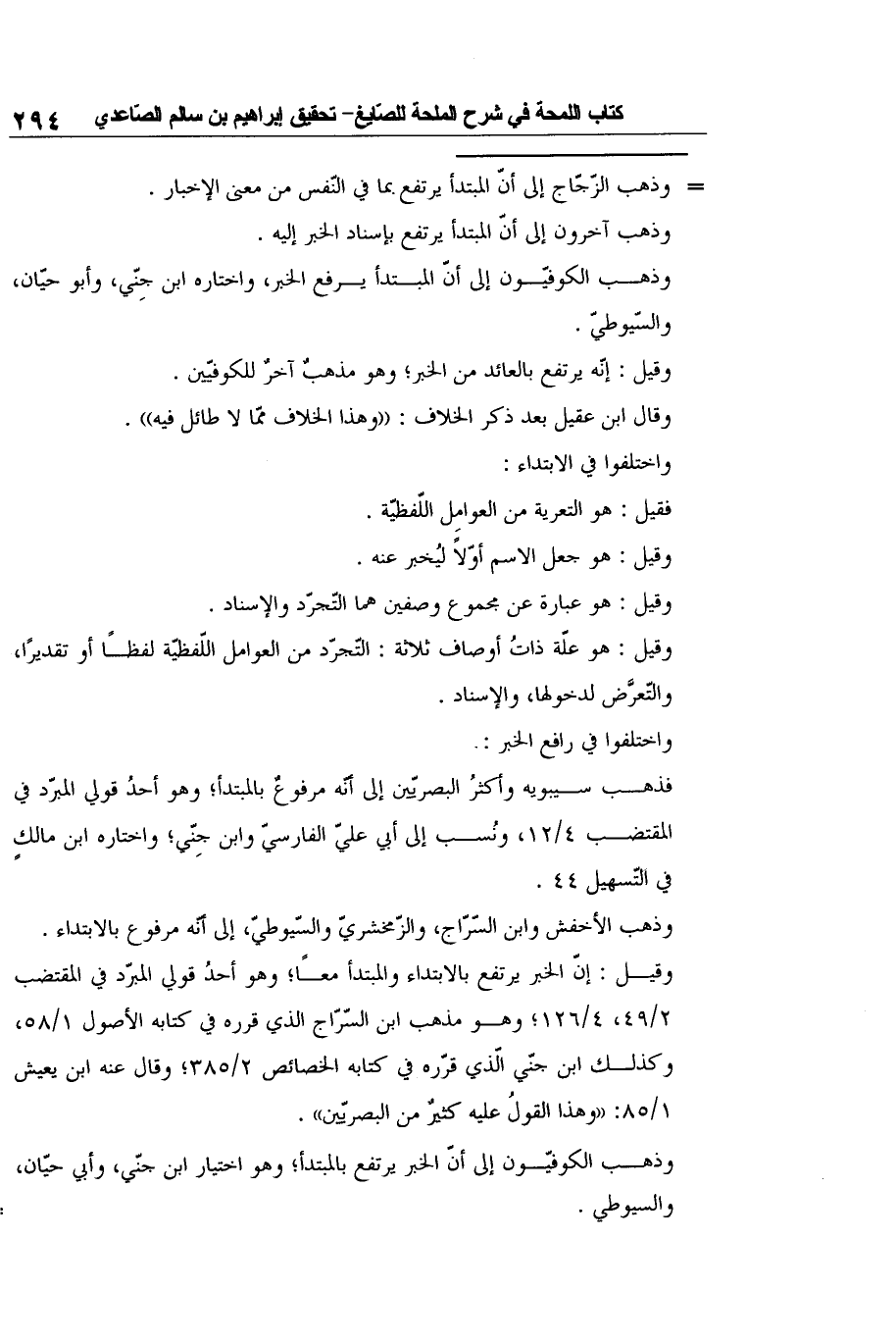 وقيل: إنّ الخبر يرتفع بالابتداء والمبتدأ معًا؛ وهو أحدُ قولي المبرّد في المقتضب 2/49، 4/126؛ وهو مذهب ابن السّرّاج الذي قرره في كتابه الأصول 1/58، وكذلك ابن جنّي الّذي قرّره في كتابه الخصائص 2/385؛ وقال عنه ابن يعيش 1/85: "وهذا القولُ عليه كثيرٌ من البصريّين".