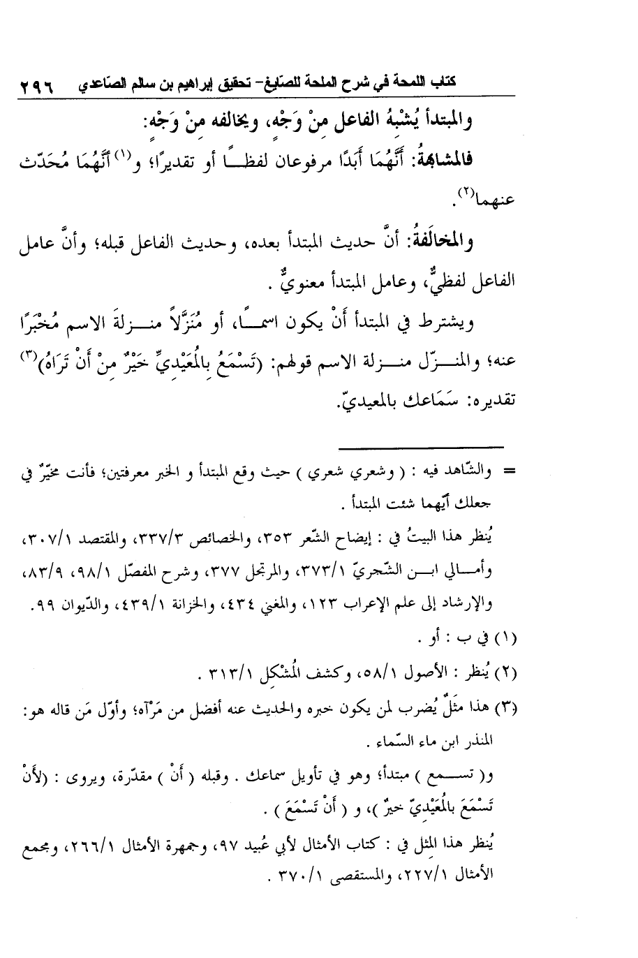 ويشترط في المبتدأ أَنْ يكون اسمًا، أو مُنَزَّلاً منزلةَ الاسم مُخْبَرًا عنه؛ والمنزّل منزلة الاسم قولهم: (تَسْمَعُ بِالمُعَيْدِيِّ خَيْرٌ مِنْ أَنْ تَرَاهُ) 3 تقديره: سَمَاعك بالمعيديّ.