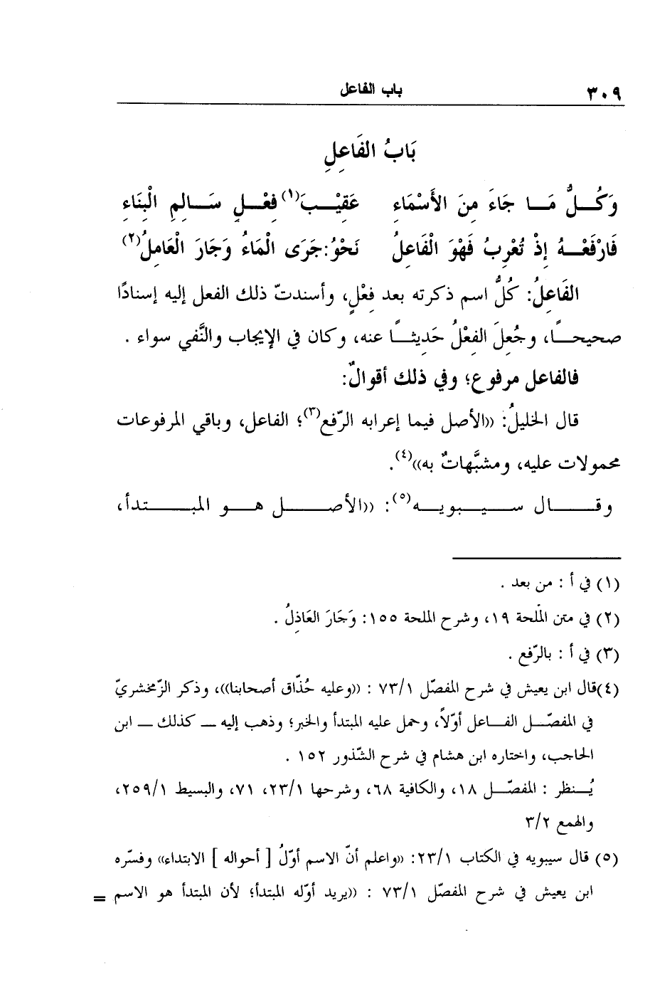 فَارْفَعْهُ إِذْ تُعْرِبُ فَهْوَ الْفَاعِلُ ... نَحْوُ: جَرَى الْمَاءُ وَجَارَ الْعَامِلُ2