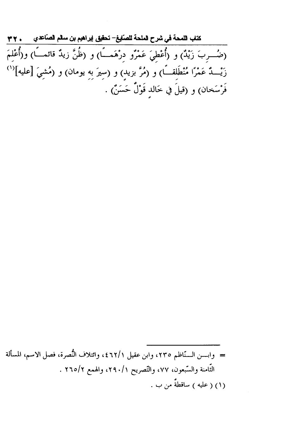 (ضُرِبَ زَيْدٌ) و (أُعْطِيَ عَمْرٌو دِرْهَمًا) و (ظُنَّ زيدٌ قائمًا) و (أُعْلِمَ زَيْدٌ عَمْرًا مُنْطَلِقًا) و (مُرَّ بزيدٍ) و (سِيرَ بِهِ يومان) و (مُشِيَ [عليه] 1 فَرْسَخان) و (قيلَ في خَالدٍ قَوْلٌ حَسَنٌ) .