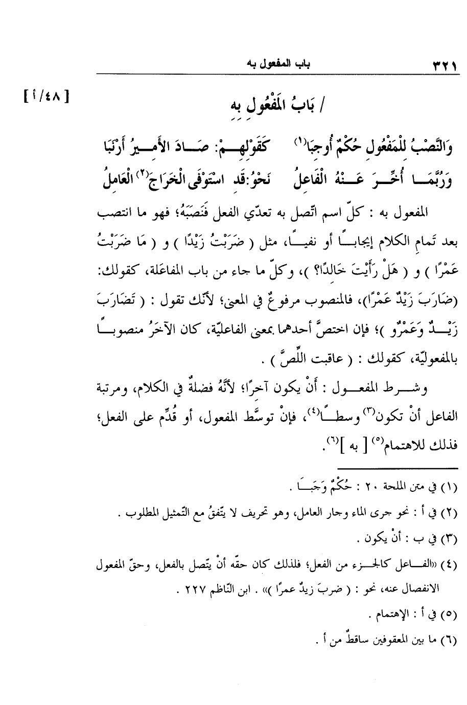 وشرط المفعول: أَنْ يكون آخِرًا؛ لأنَّهُ فضلةٌ في الكلام، ومرتبة الفاعل أنْ تكون3 وسطًا4، فإنْ توسَّط المفعول، أو قُدِّم على الفعل؛ فذلك للاهتمام5 [به] 6.