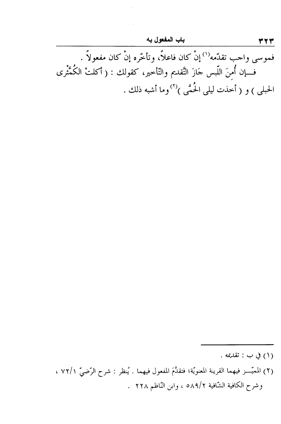 2 المميّز فيهما القرينة المعنويّة؛ فتقدَّمَ المفعول فيهما. يُنظر: شرح الرّضيّ 1/72، وشرح الكافية الشّافية 2/589، وابن النّاظم 228.