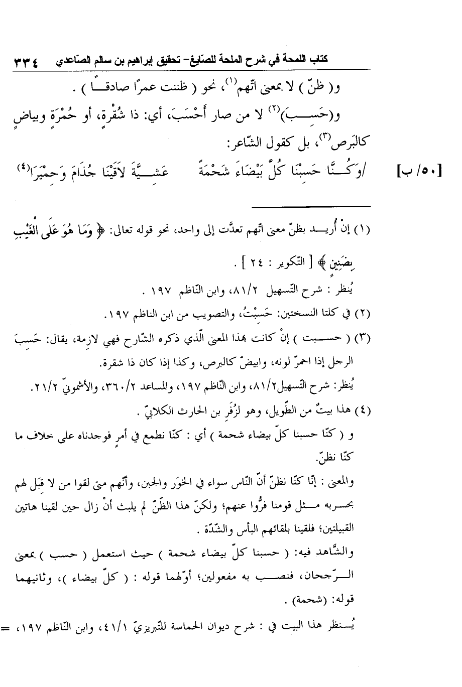 و (حَسِبَ) 2 لا من صار أَحْسَبَ، أي: ذا شُقْرةٍ، أو حُمْرَةٍ وبياضٍ كالبَرص3، بل كقول الشّاعر: