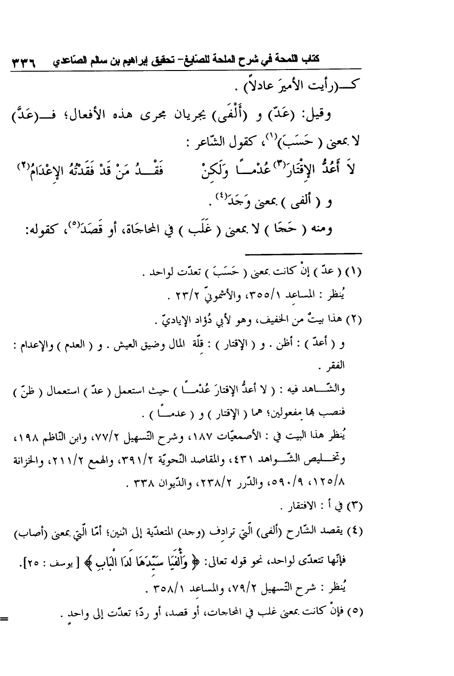 4 يقصد الشّارح (ألفى) الّتي ترادِف (وجد) المتعدّية إلى اثنين؛ أمّا الّتي بمعنى (أصاب) فإنّها تتعدّى لواحد، نحو قوله تعالى: {وَأَلْفَيَا سَيِّدَهَا لَدَا الْبَابِ} [يوسف: 25] .