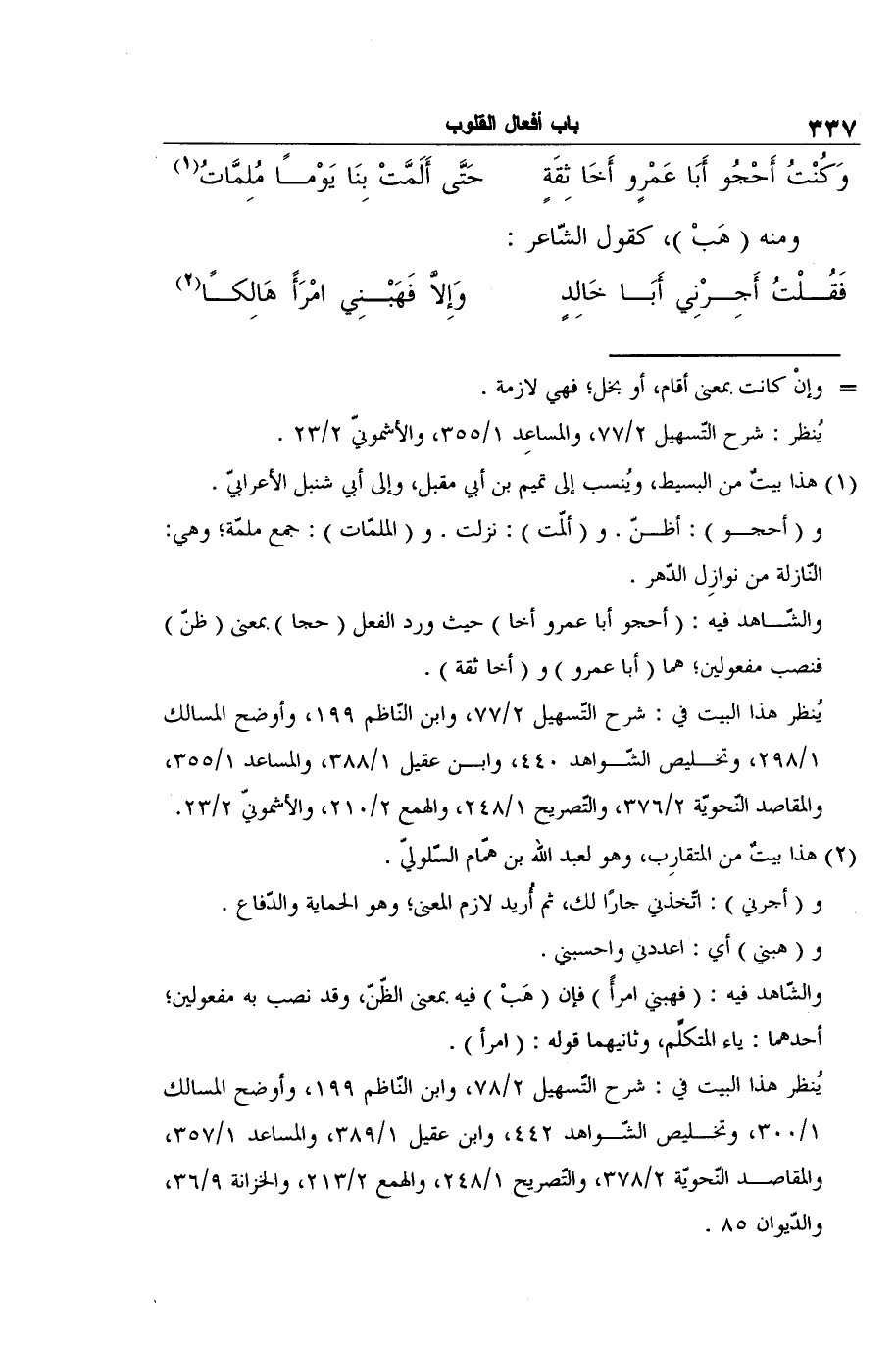 والشّاهد فيه: (أحجو أبا عمرو أخا) حيث ورد الفعل (حجا) بمعنى (ظنّ) فنصب مفعولين؛ هما (أبا عمرو) و (أخا ثقة) .