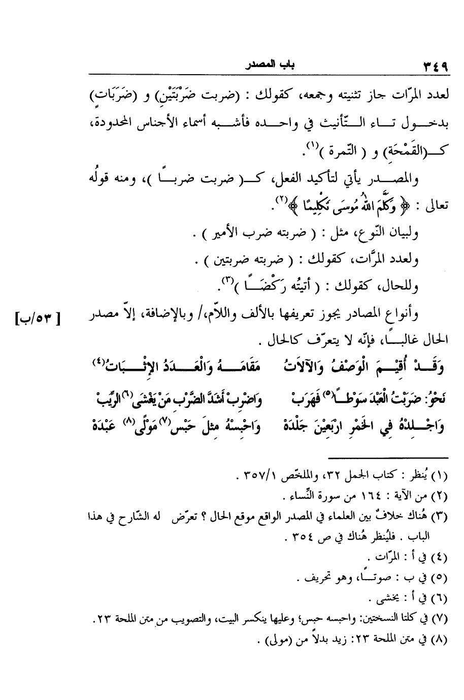 3 هُناك خلافٌ بين العلماء في المصدر الواقع موقع الحال؟ تعرّض له الشّارح في هذا الباب. فليُنظر هُناك في ص 354.