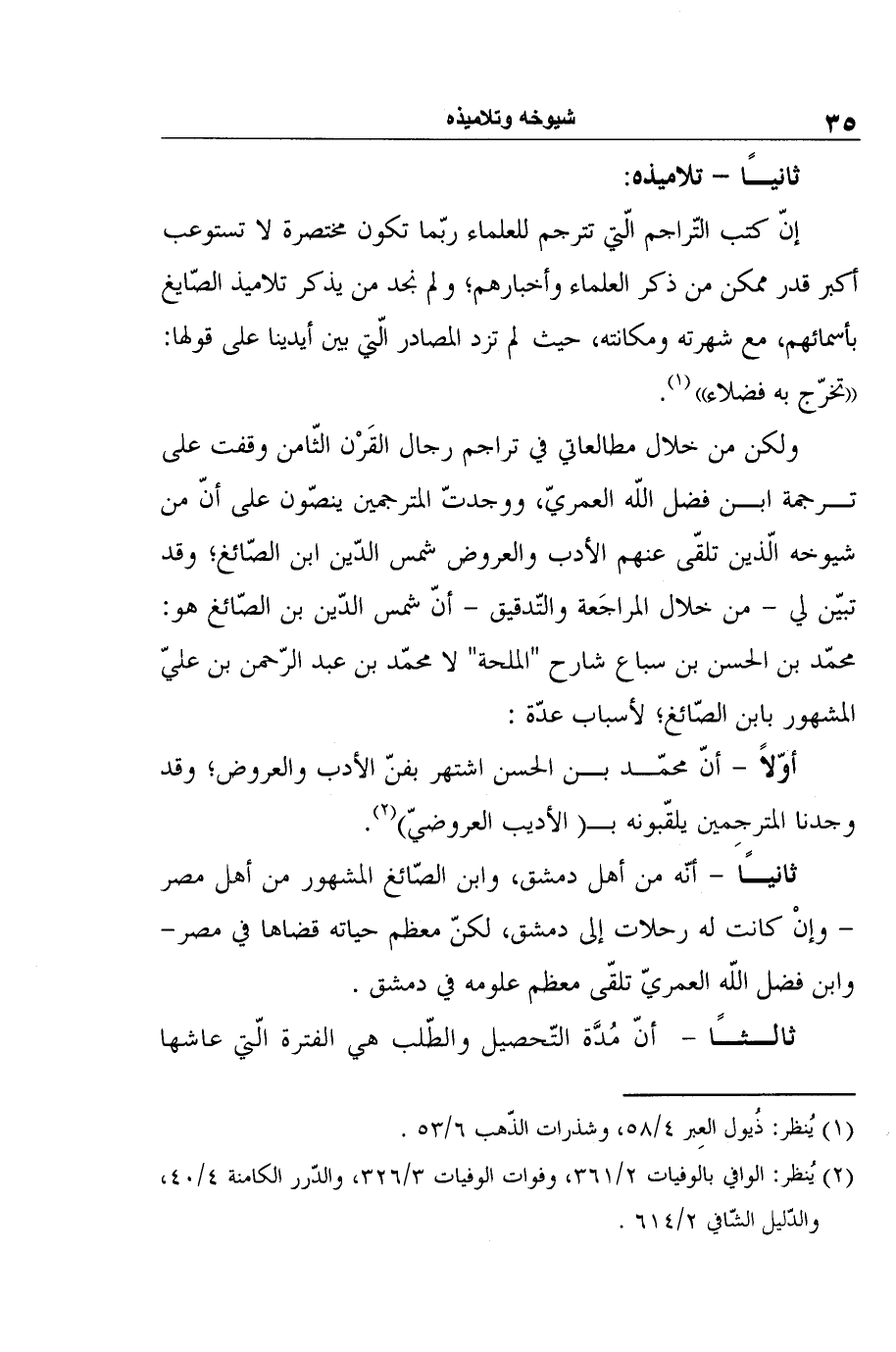 ولكن من خلال مطالعاتي في تراجم رجال القَرْن الثّامن وقفت على ترجمة ابن فضل الله العمريّ، ووجدتّ المترجمين ينصّون على أنّ من شيوخه الّذين تلقّى عنهم الأدب والعروض شمس الدّين ابن الصّائغ؛ وقد تبيّن لي - من خلال المراجَعة والتّدقيق - أنّ شمس الدّين بن الصّائغ هو: محمّد بن الحسن بن سباع شارح "الملحة" لا محمّد بن عبد الرّحمن بن عليّ المشهور بابن الصّائغ؛ لأسباب عدّة: