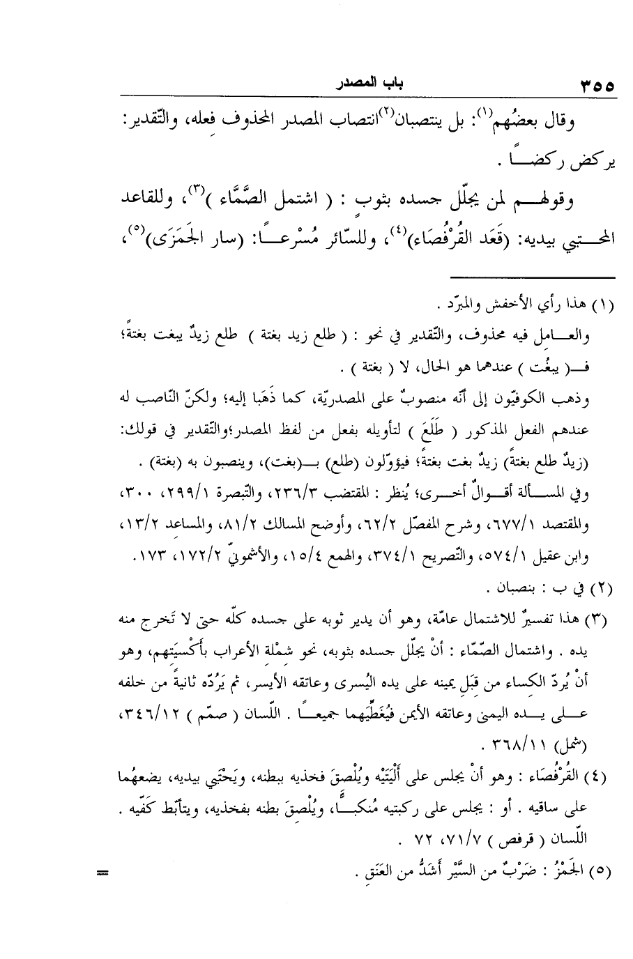وقولهم لمن يجلّل جسده بثوبٍ: (اشتمل الصَّمَّاء) 3، وللقاعد المحتبي بيديه: (قَعَد القُرْفُصَاء) 4، وللسّائر مُسْرعًا: (سار الجَمَزَى) 5،