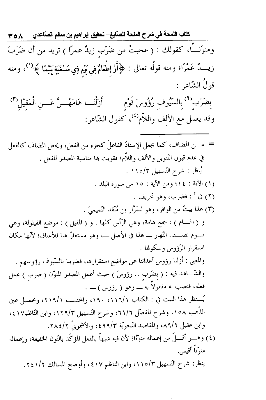 والشّاهد فيه: (بِضَربٍ.. رؤوسَ) حيث أعمل المصدر المنوّن (ضربٍ) عمل فعله، فنصب به مفعولاً به - وهو (رؤوس) -.