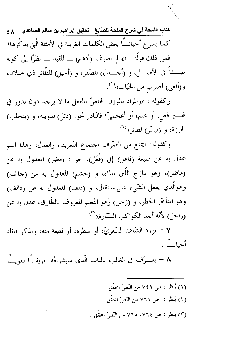 وكقوله: "يمنع من الصّرف اجتماع التّعريف والعدل، وهذا اسم عدل به عن صيغة (فاعل) إلى (فُعَل) ، نحو: (مضر) المعدول به عن (ماضر) ، وهو مازج اللّبن بالماء، و (جشم) المعدول به عن (جاشم) وهوالّذي يفعل الشّيء علىاستثقال، و (دلف) المعدول به عن (دالف) وهو المتأخّر الخطو، و (زحل) وهو النّجم المعروف بالطّارق، عدل به عن (زاحل) لأنّه أبعد الكواكب السّيّارة"3.