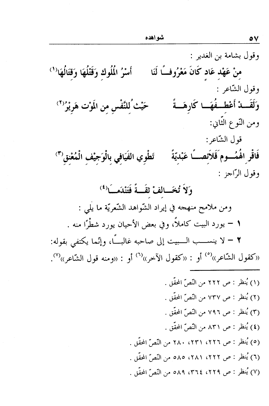 2- لا ينسب البيت إلى صاحبه غالبًا، وإنّما يكتفي بقوله: "كقول الشّاعر"5 أو: "كقول الآخر"6 أو: "ومنه قول الشّاعر"7.