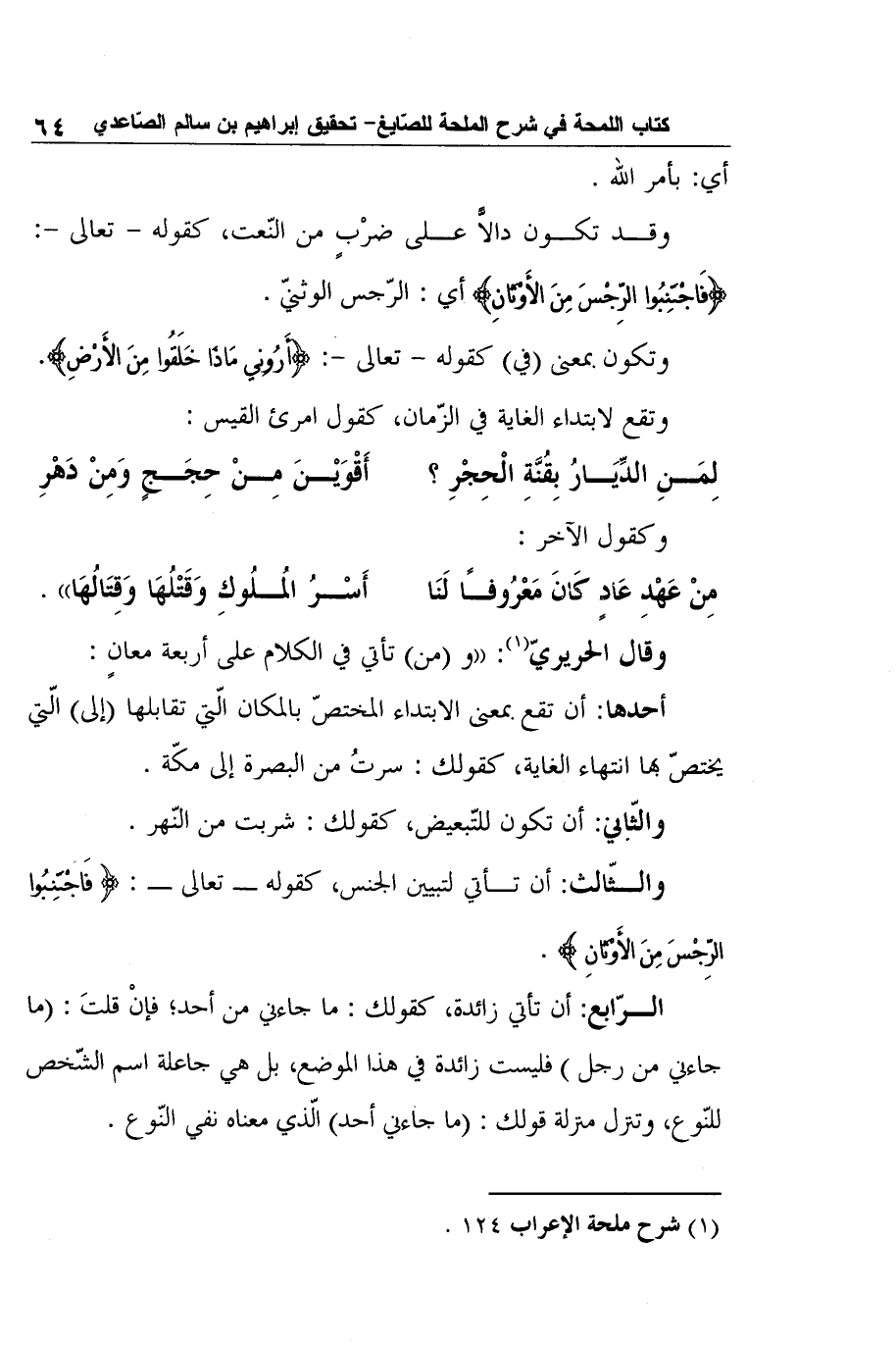 وقال الحريريّ1: "و (من) تأتي في الكلام على أربعة معانٍ: