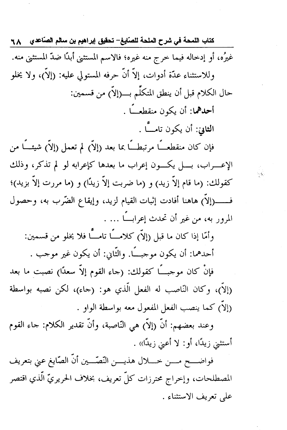 فواضح من خلال هذين النّصّين أنّ الصّايغ عني بتعريف المصطلحات، وإخراج محترزات كلّ تعريف، بخلاف الحريريّ الّذي اقتصر على تعريف الاستثناء.