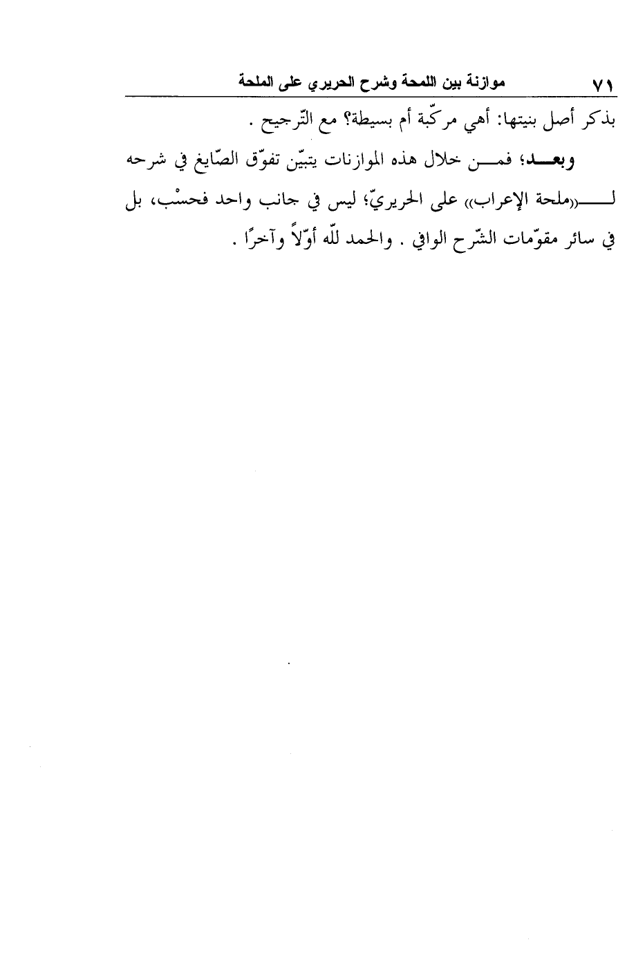 وبعد؛ فمن خلال هذه الموازنات يتبيّن تفوّق الصّايغ في شرحه ل (ملحة الإعراب) على الحريريّ؛ ليس في جانب واحد فحسْب، بل في سائر مقوّمات الشّرح الوافي. والحمد لله أوّلاً وآخرًا.