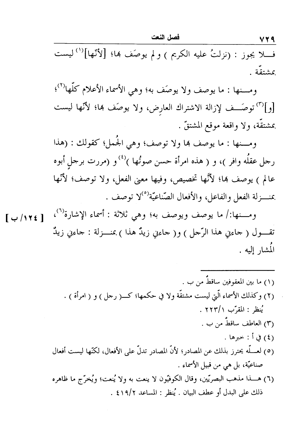 ومنها: ما يوصف ويوصف به؛ وهي ثلاثة: أسماء الإشارة6، تقول (جاءني هذا الرّجل) و (جاءني زيدٌ هذا) بمنزلة: جاءني زيدٌ المُشار إليه. [124/ب]