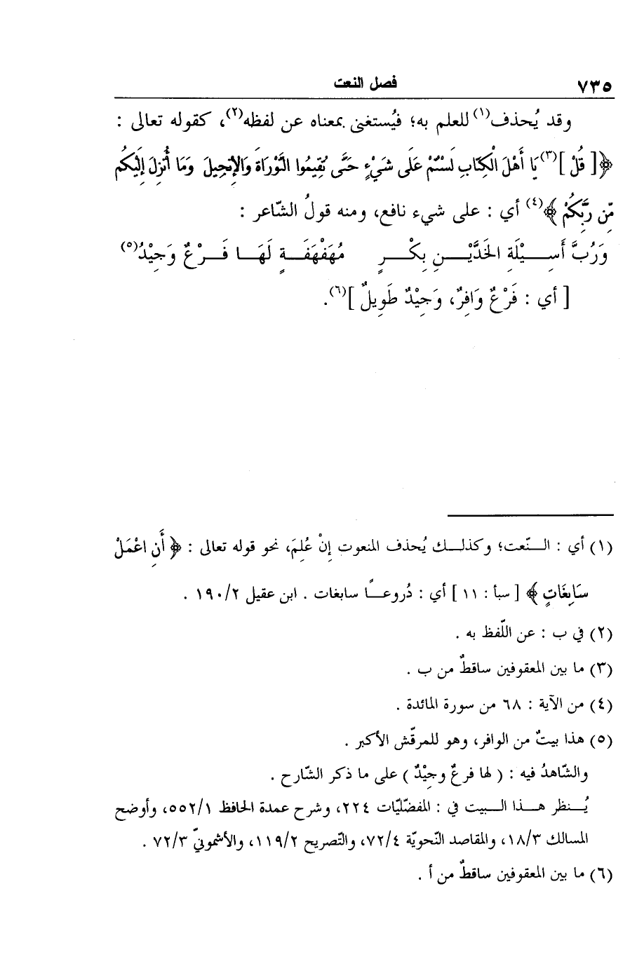 1 أي: النّعت؛ وكذلك يُحذف المنعوت إِنْ عُلِمَ، نحو قوله تعالى: {أَنِ اعْمَلْ سَابِغَاتٍ} [سبأ: 11] أي: دُروعًا سابغات. ابن عقيل 2/190.