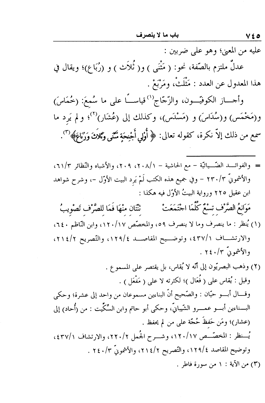 1 يُنظر: ما ينصرف وما لا ينصرف 59، والمخصّص 17/120، وابن النّاظم 640، والارتشاف 1/437، وتوضيح المقاصد 4/129، والتّصريح 2/214، والأشمونيّ 3/240.