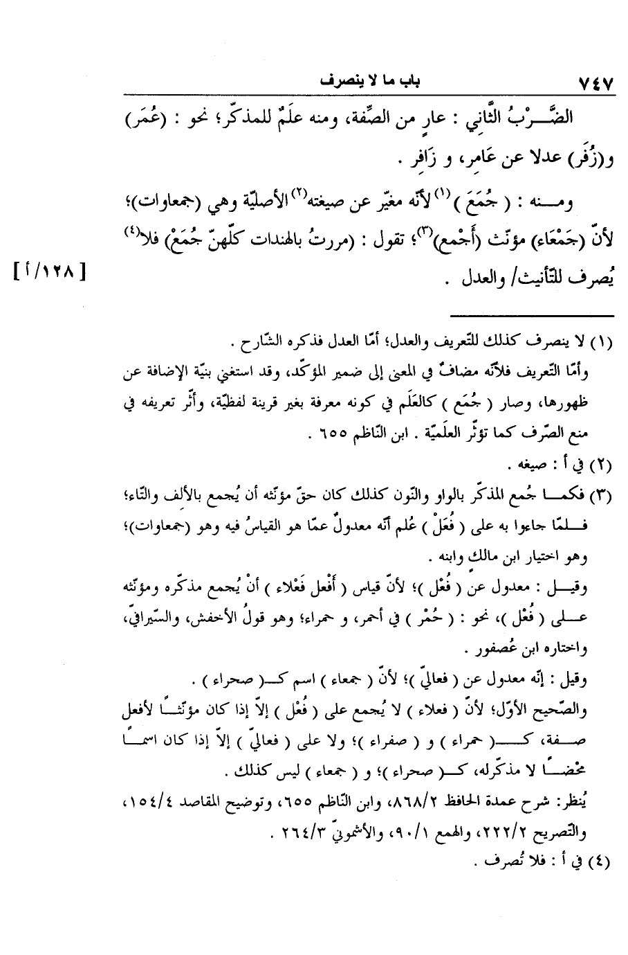 ومنه: (جُمَعَ) 1 لأنّه مغيّر عن صيغته2 الأصليّة وهي (جمعاوات) ؛ لأنّ (جَمْعَاء) مؤنّث (أَجْمع) 3؛ تقول: (مررتُ بالهندات كلّهنّ جُمَعْ) فلا4 يُصرف للتّأنيث [128/ أ]