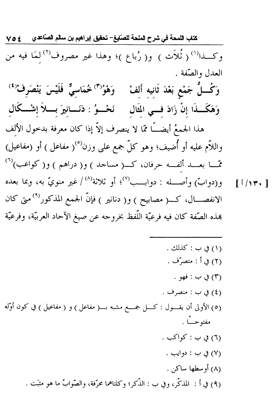 هذا الجمعُ أيضا ممّا لا ينصرف إلاّ إذا كان معرفة بدخول الألِف واللاّم عليه أو أُضيف؛ وهو كلّ جمع على وزن5 (مفاعل) أو (مفاعيل) ممّا بعد ألِفه حرفان، ك (مساجد) و (دراهم) و (كواعب) 6 و (دوابّ) وأصله: دوابب7؛ أو ثلاثة8 [130/ أ] غير منويّ به، وبما بعده الانفصال، ك (مصابيح) و (دنانير) فإنّ الجمع المذكور9 متى كان بهذه الصّفة كان فيه فرعيّة اللّفظ بخروجه عن صيغ الآحاد العربيّة، وفرعيّة