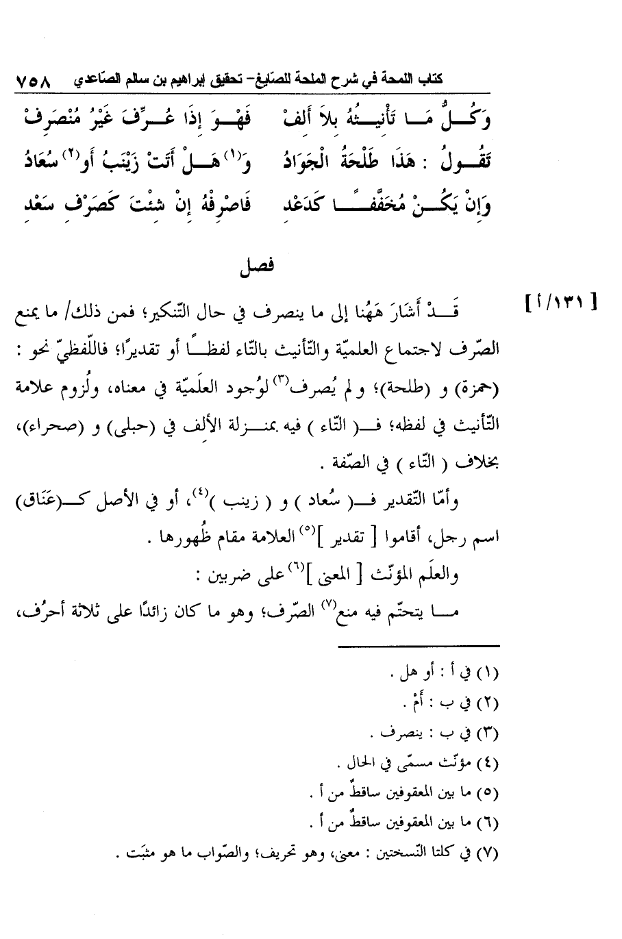 قَدْ أَشَارَ هَهُنا إلى ما ينصرف في حال التّنكير؛ فمن ذلك [131/أ] ما يمنع الصّرف لاجتماع العلميّة والتّأنيث بالتّاء لفظا أو تقديرًا؛ فاللّفظيّ نحو: (حمزة) و (طلحة) ؛ ولم يُصرف3 لوُجود العلَميّة في معناه، ولُزوم علامة التّأنيث في لفظه؛ ف (التّاء) فيه بمنزلة الألِف في (حبلى) و (صحراء) ، بخلاف (التّاء) في الصّفة.