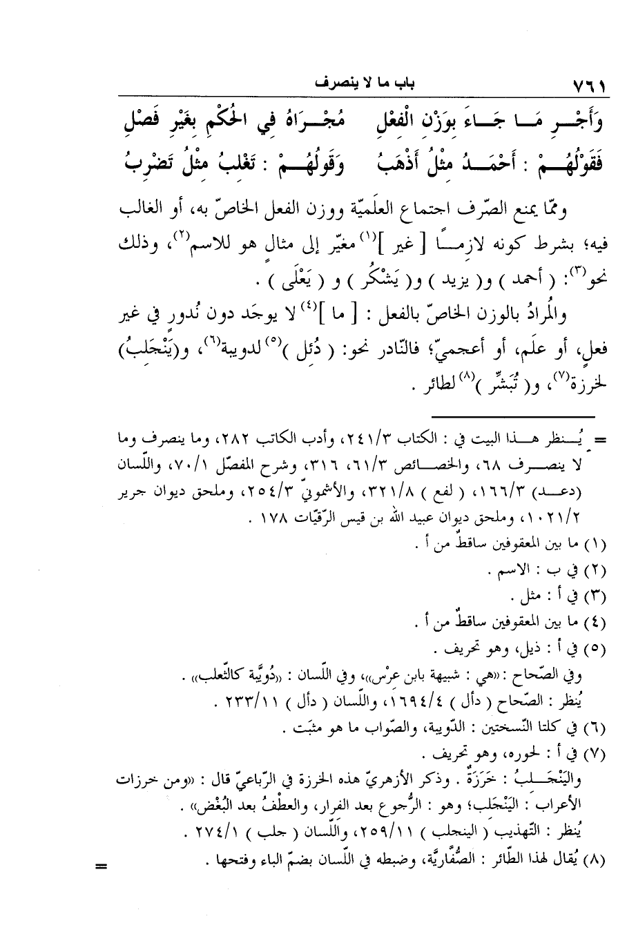 فَقَوْلُهُمْ: أَحْمَدُ مِثْلُ أَذْهَبُ ... وَقَولُهُمْ: تَغْلِبُ مِثْلُ تَضْرِبُ