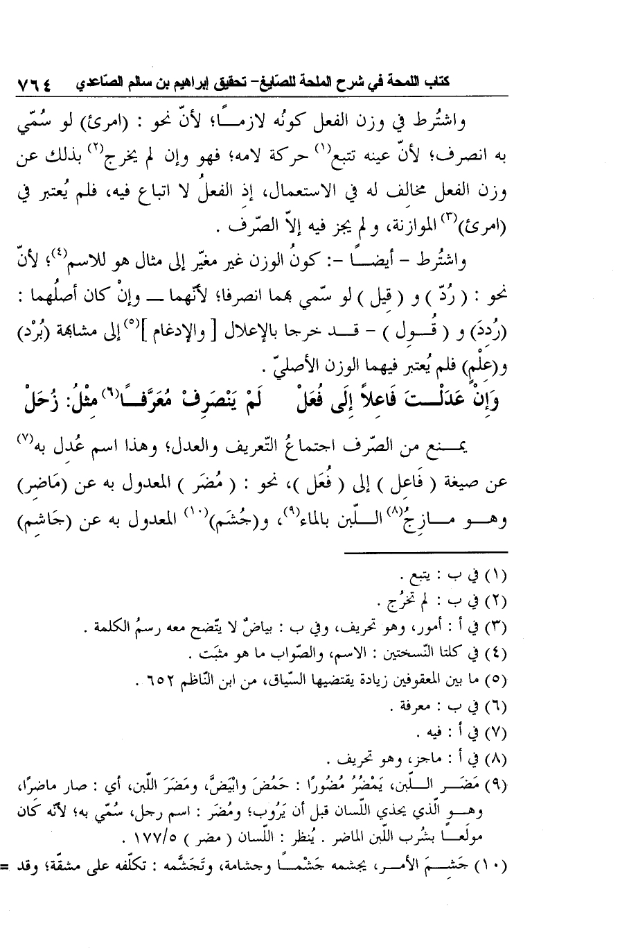 واشتُرط - أيضا -: كونُ الوزن غير مغيّر إلى مثال هو للاسم4؛ لأنّ نحو: (رُدّ) و (قِيل) لو سّمي بهما انصرفا؛ لأنّهما - وإنْ كان أصلُهما: (رُدِدَ) و (قُوِل) - قد خرجا بالإعلال [والإدغام] 5 إلى مشابهة (بُرْد) و (عِلْمٍ) فلم يُعتبر فيهما الوزن الأصليّ.