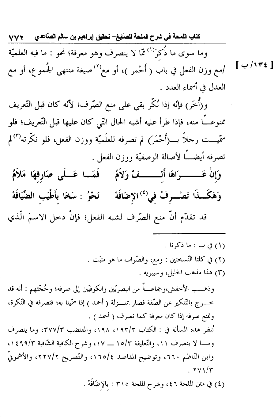 وما سوى ما ذُكِرَ1 ممّا لا ينصرف وهو معرفة؛ نحو: ما فيه العلميّة / مع وزن الفعل في باب (أَحْمر) ، أو مع2 صيغة منتهى الجُموع، أو مع العدل في أسماء العدد. [134/ب]