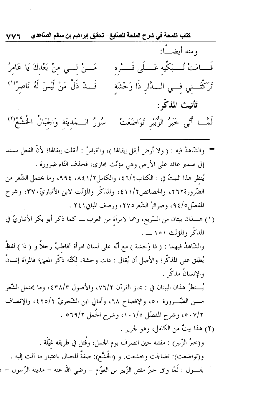 والشّاهدُ فيهما: (ذا وَحشة) مع أنّه على لسان امرأة تخاطِبُ رجلاً و (ذا) لفظٌ يُطلق على المذكّر؛ والأصل أن يُقال: ذات وحشة، لكنّه ذكّر المعنى؛ فالمرأة إنسانٌ والإنسانُ مذكّر.