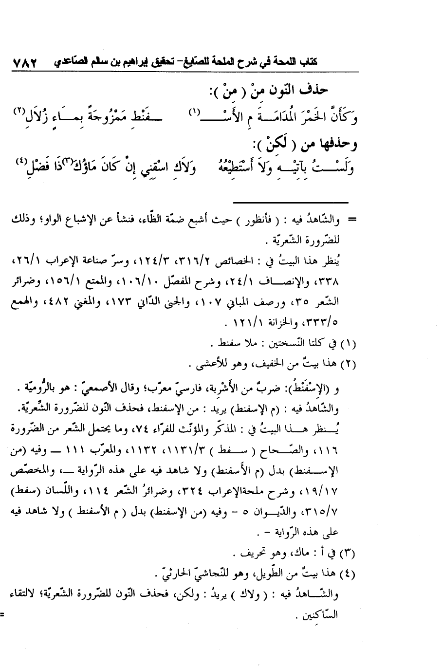 والشّاهدُ فيه: (م الإسفنط) يريد: من الإسفنط، فحذف النّون للضّرورة الشِّعريّة.