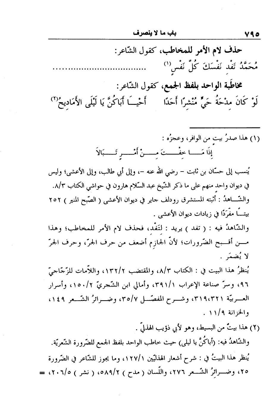 والشّاهدُ فيه: (أباكُنَّ يا ليلى) حيث خاطب الواحد بلفظ الجمع للضّرورة الشّعريّة.