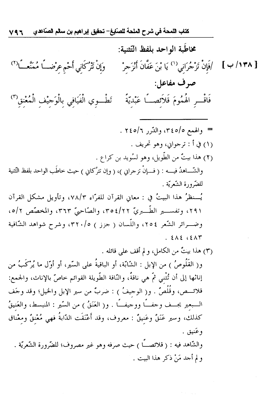والشّاهدُ فيه: (فإنْ تزجراني) ، (وإن تترُكاني) حيث خاطَب الواحد بلفظ التّثنية للضّرورة الشّعريّة.