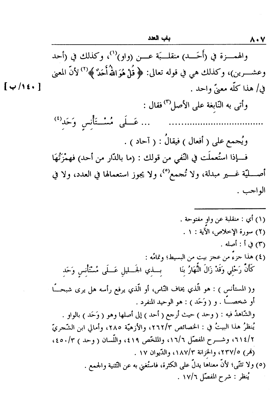 والهمزة في (أَحَد) منقلبَة عن (واو) 1، وكذلك في (أحد وعشرين) ، وكذلك هي في قوله تعالى: {قُلْ هُوَ اللهُ أَحَدٌ} 2 لأنّ المعنى في هذا كلّه معنىً واحد. [140/ب]