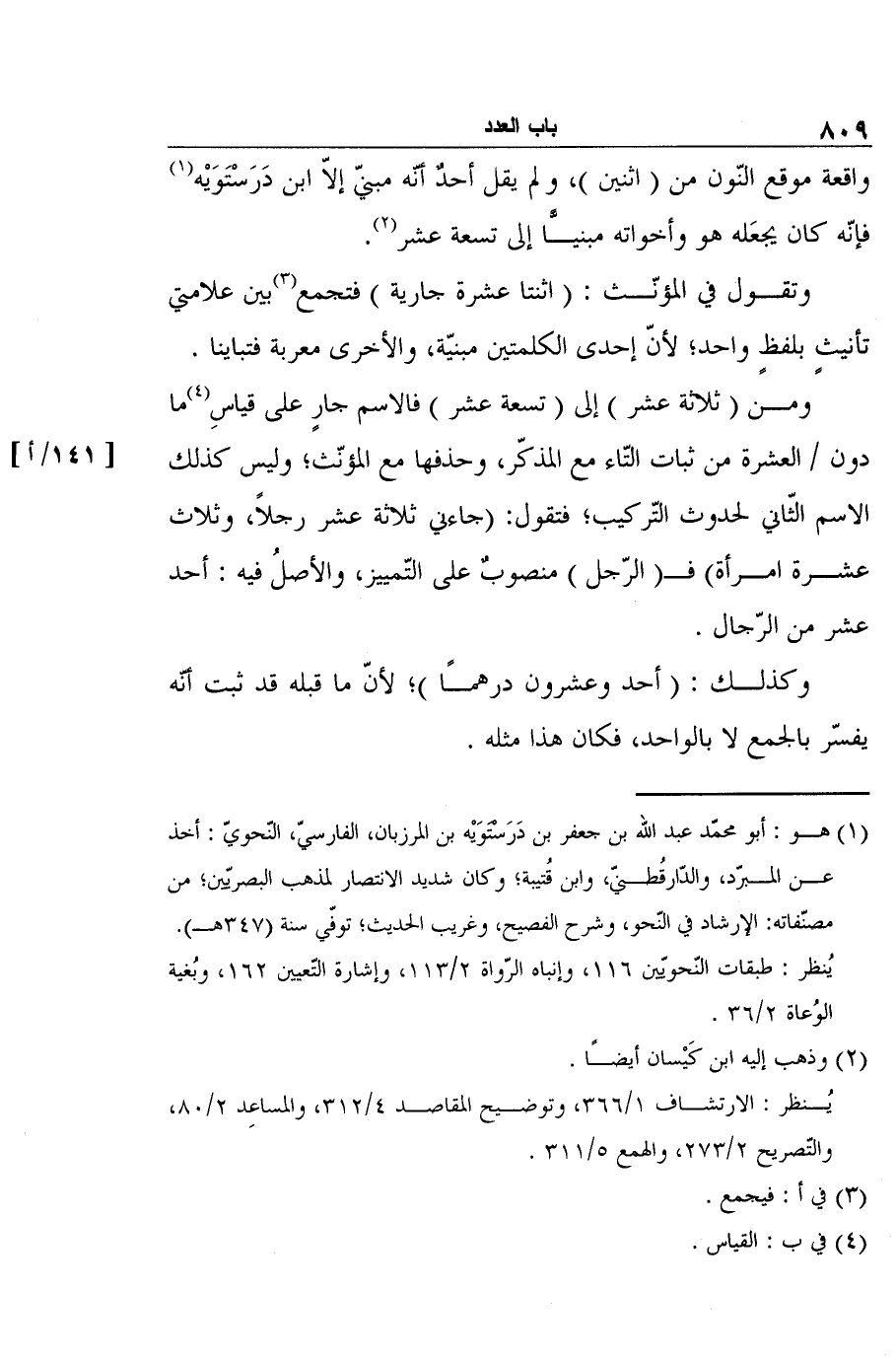 1 هو: أبو محمّد عبد الله بن جعفر بن دَرَسْتَوَيْه بن المرزبان، الفارسيّ، النّحويّ: أخذ عن المبرّد، والدّارقُطنيّ، وابن قُتيبة؛ وكان شديد الانتصار لمذهب البصريّين؛ من مصنّفاته: الإرشاد في النّحو، وشرح الفصيح، وغريب الحديث؛ توفّي سنة (347هـ) .