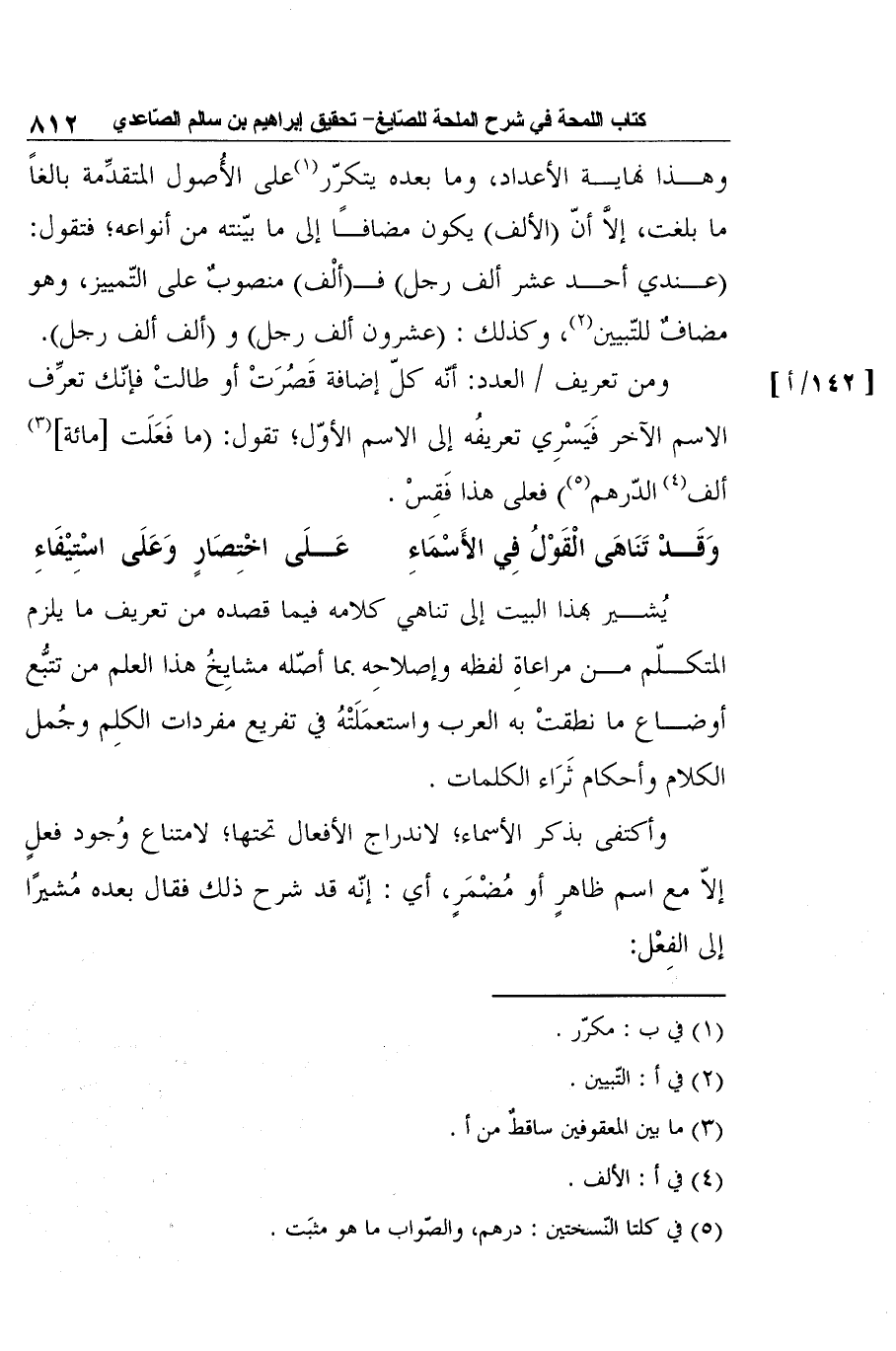 ومن تعريف العدد: أنّه كلّ إضافة قَصُرَتْ أو طالتْ فإنّك تعرِّف الاسم الآخر فَيَسْرِي تعريفُه إلى الاسم الأوّل؛ تقول: (ما فَعَلَت [مائة] 3 ألف4 الدّرهم5) فعلى هذا فَقِسْ. [142/أ]
