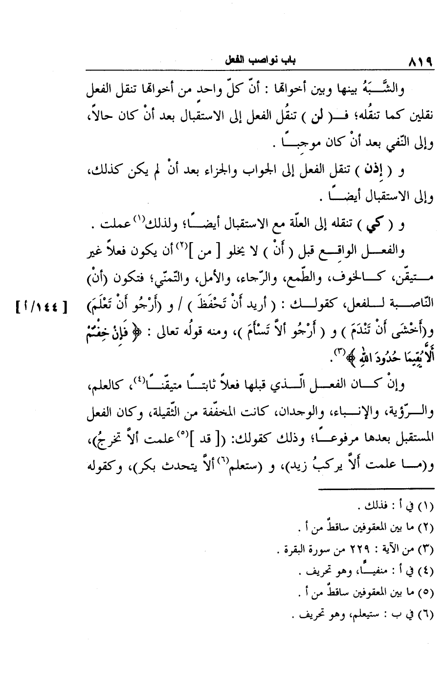 والفعل الواقِع قبل (أَنْ) لا يخلو [من] 2 أن يكون فعلاً غير متيقّن، كالخوف، والطّمع، والرّجاء، والأمل، والتّمنّي؛ فتكون (أنْ) النّاصبة للفعل، كقولك: (أريد أَنْ تَحْفَظَ) [144/أ]