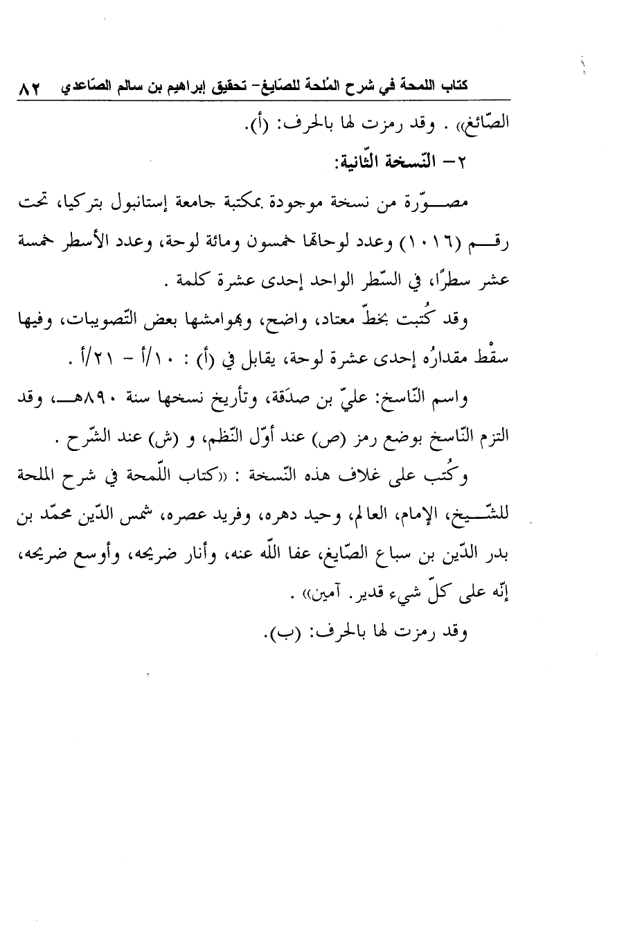 واسم النّاسخ: عليّ بن صدَقة، وتأريخ نسخها سنة 890هـ، وقد التزم النّاسخ بوضع رمز (ص) عند أوّل النّظم، و (ش) عند الشّرح.