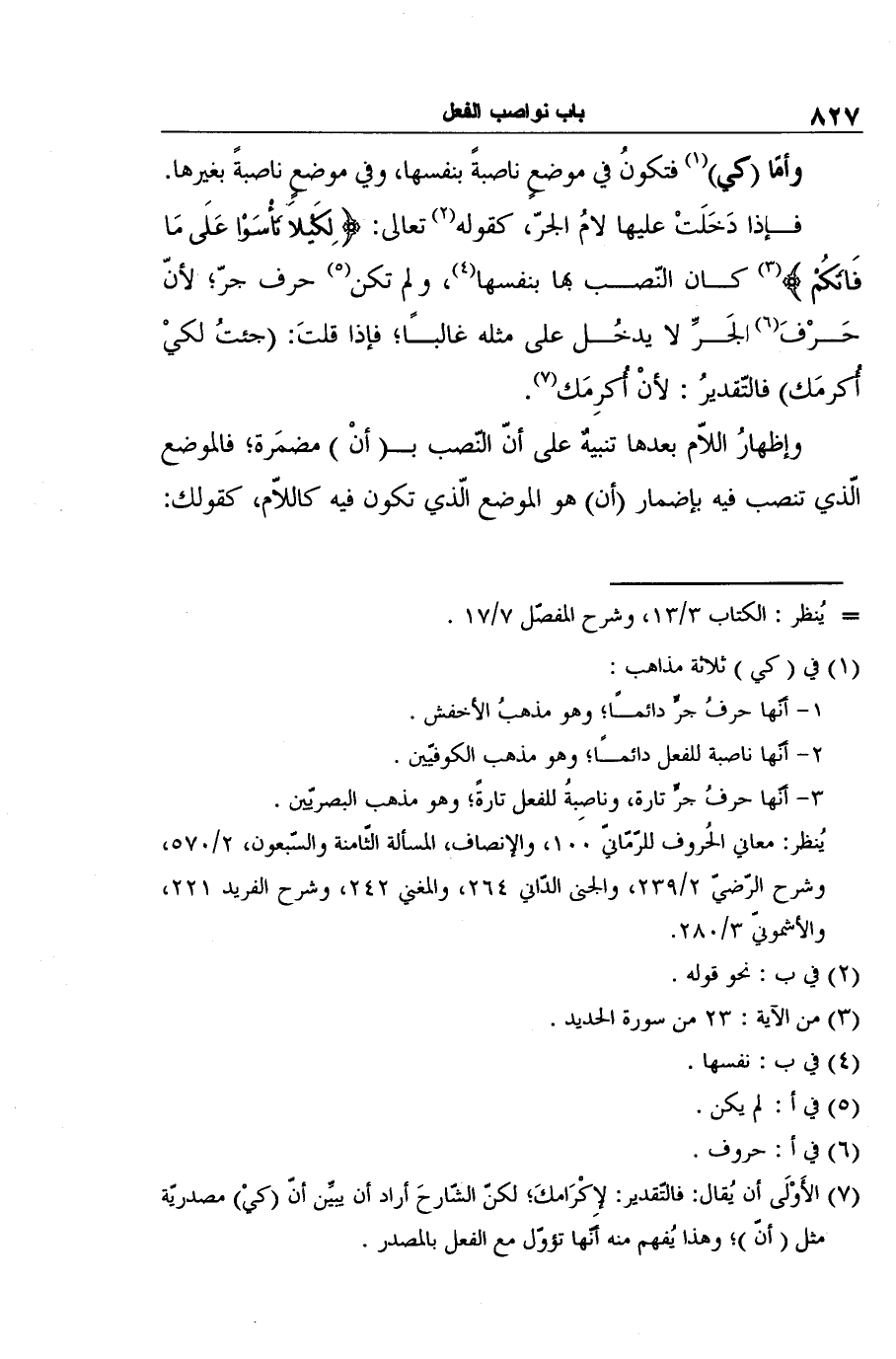 7 الأَوْلَى أن يُقال: فالتّقدير: لإِكْرَامكَ؛ لكنّ الشّارحَ أراد أن يبيِّن أنّ (كيْ) مصدريّة مثل (أنّ) ؛ وهذا يُفهم منه أنّها تؤوّل مع الفعل بالمصدر.