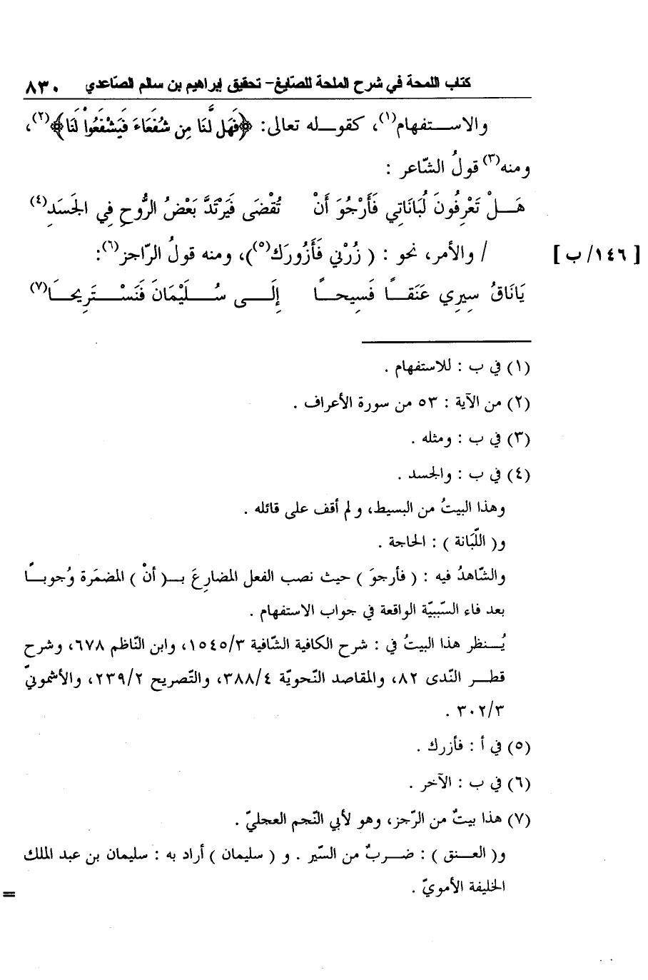 والاستفهام1، كقوله تعالى: {َهَل لَّنَا مِن شُفَعَاءَ فَيَشْفَعُواْ لَنَا} 2، ومنه3 قولُ الشّاعر: