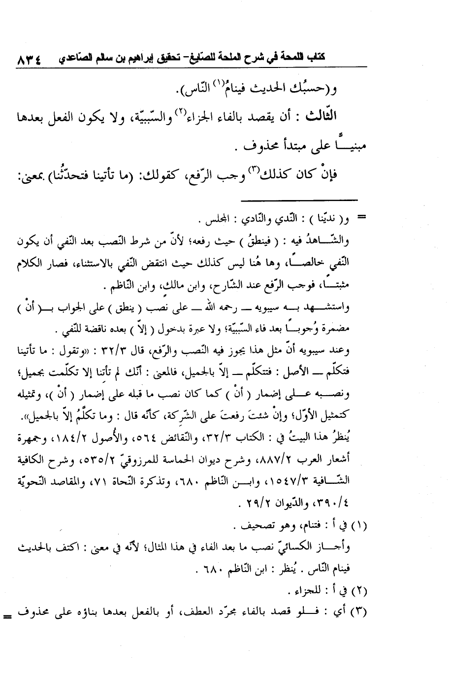 وأجاز الكسائيّ نصب ما بعد الفاء في هذا المثال؛ لأنّه في معنى: اكتف بالحديث فينام النّاس. يُنظر: ابن النّاظم 680.