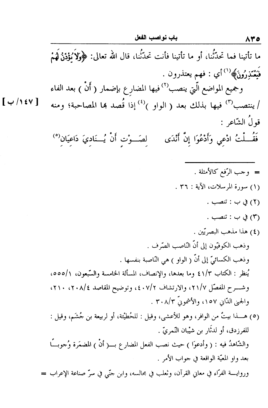 وجميع المواضع الّتي ينصب2 فيها المضارِع بإضمار (أَنْ) بعد الفاء ينتصب3 فيها بذلك بعد (الواو) 4 إذا قُصد بها المصاحبة؛ ومنه قولُ الشّاعر: [147/ب]