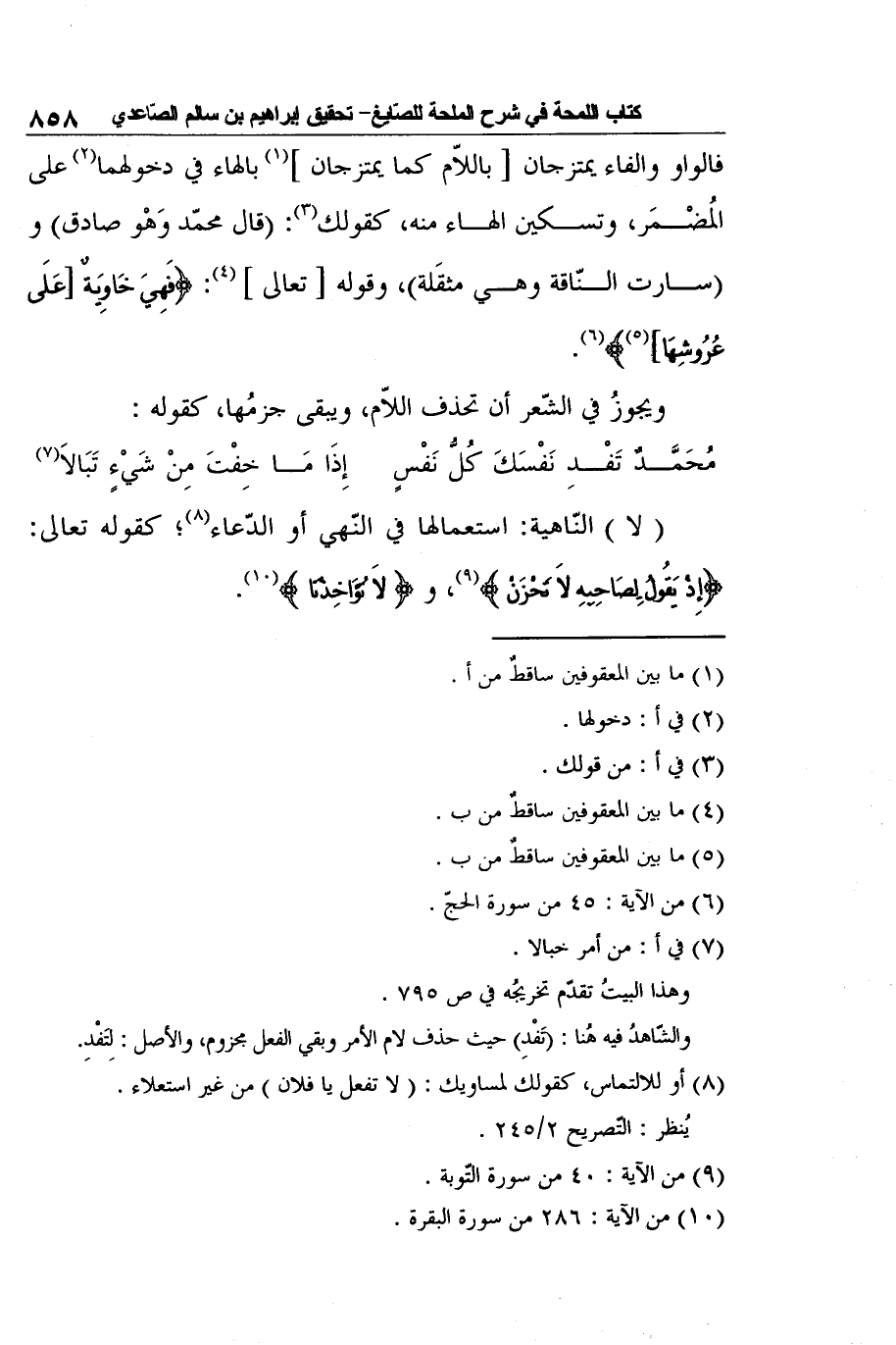(لا) النّاهية: استعمالها في النّهي أو الدّعاء8؛ كقوله تعالى: {إِذْ يَقُولُ لِصَاحِبِهِ لاَ تَحْزَنْ} 9، و {لاَ تُؤَاخِذْنَا} 10.