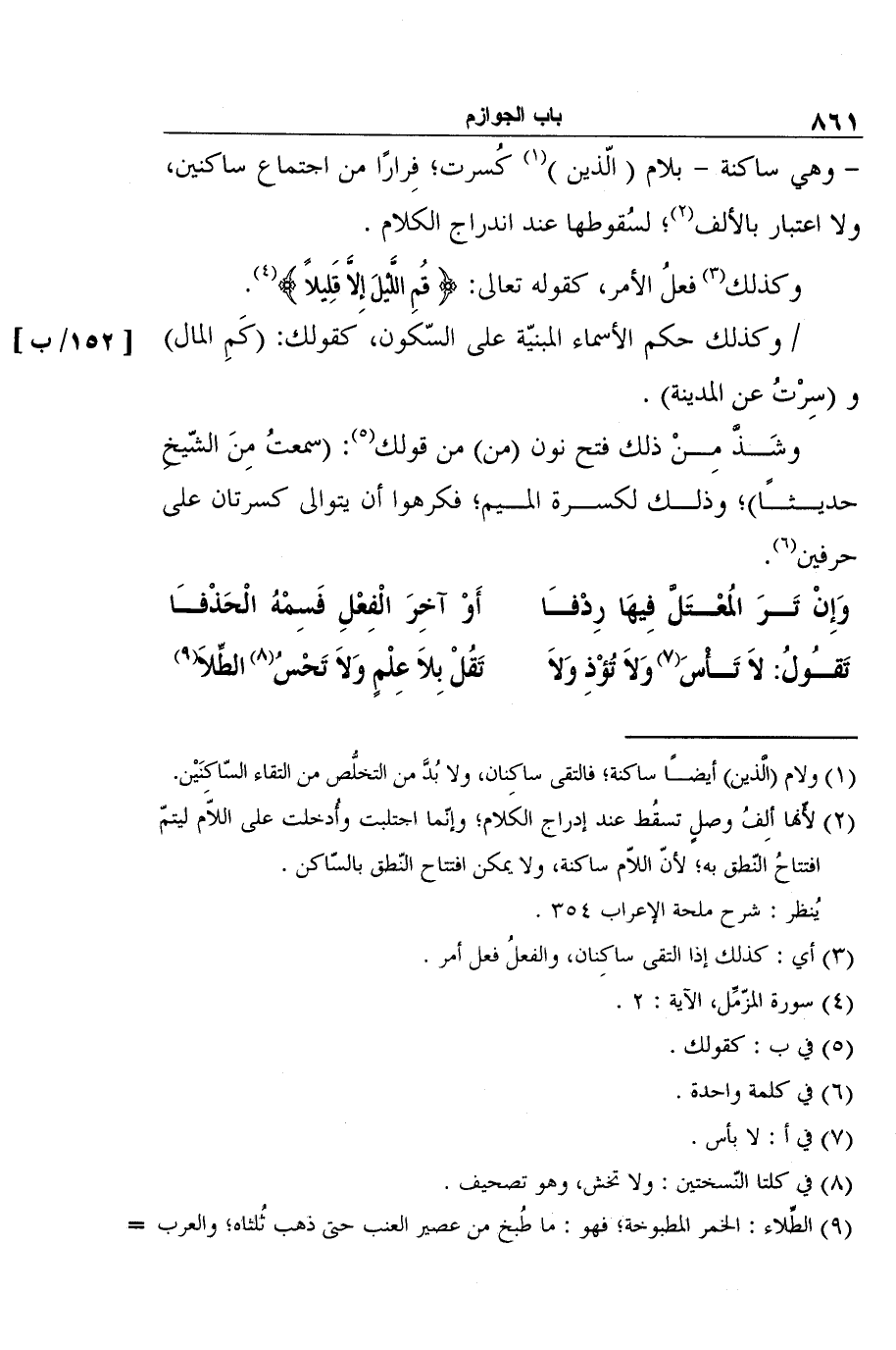 [152/ب] وكذلك حكم الأسماء المبنيّة على السّكون، كقولك: (كَمِ المال) و (سِرْتُ عن المدينة) .
