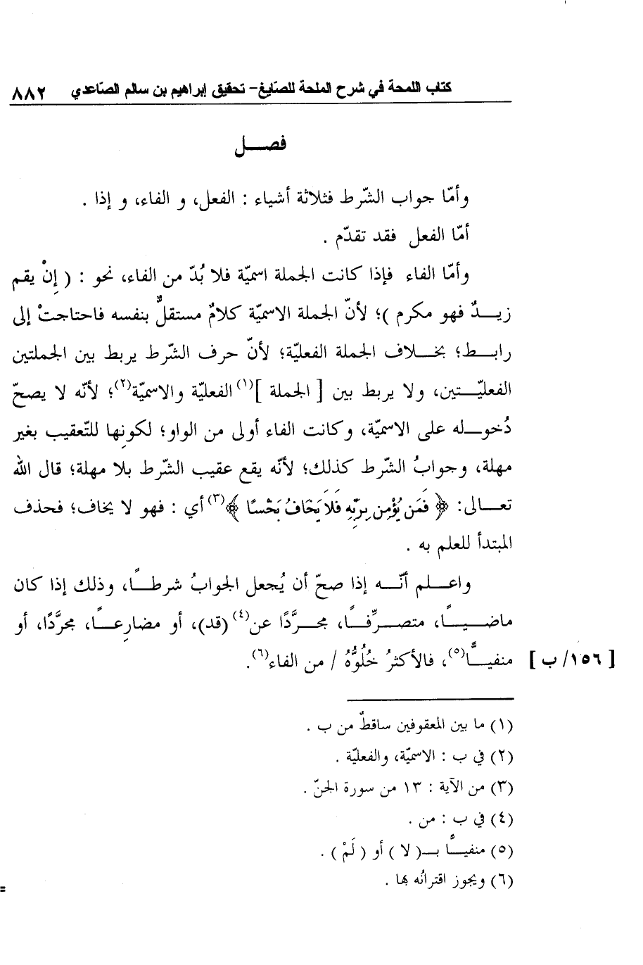 واعلم أنّه إذا صحّ أن يُجعل الجوابُ شرطًا، وذلك إذا كان ماضيًا، متصرِّفًا، مجرَّدًا عن4 (قد) ، أو مضارِعًا، مجرَّدًا، أو منفيًّا5، فالأكثرُ خُلُوُّهُ من الفاء6. [156/ب]