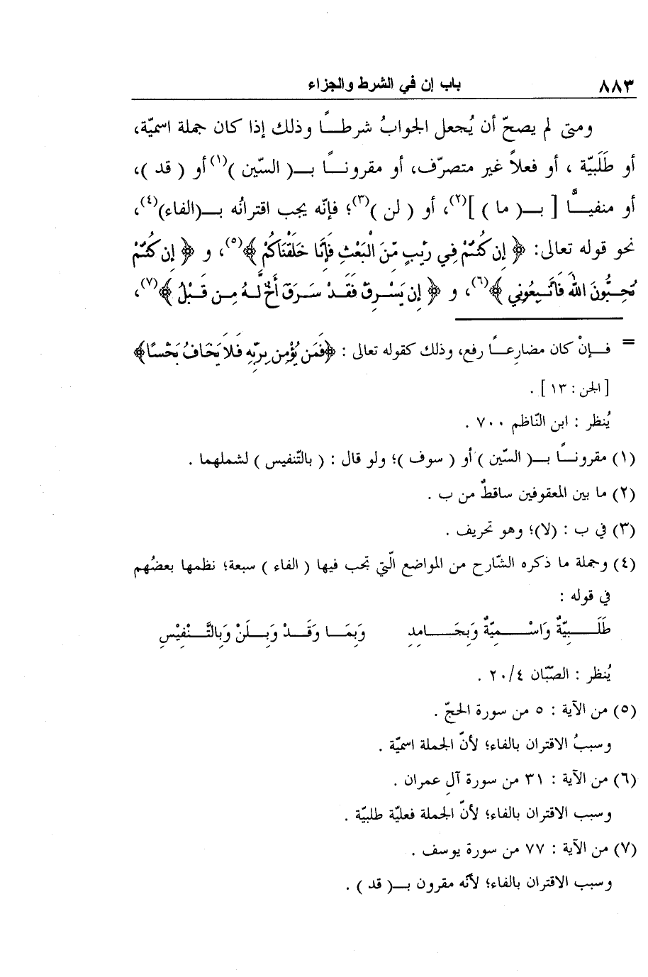 ومتى لم يصحّ أن يُجعل الجوابُ شرطًا وذلك إذا كان جملة اسميّة، أو طَلَبيّة، أو فعلاً غير متصرّف، أو مقرونًا بـ (السّين) 1 أو (قد) ، أو منفيًّا [بـ (ما) ] 2، أو (لن) 3؛ فإنّه يجب اقترانُه بـ (الفاء) 4، نحو قوله تعالى: {إِن كُنتُمْ فِي رَيْبٍ مِّنَ الْبَعْثِ فَإِنَّا خَلَقْنَاكُمْ} 5، و {إِن كُنتُمْ تُحِبُّونَ اللهَ فَاتَّبِعُونِي} 6، و {إِن يَسْرِقْ فَقَدْ سَرَقَ أَخٌ لَّهُ مِن قَبْلُ} 7،