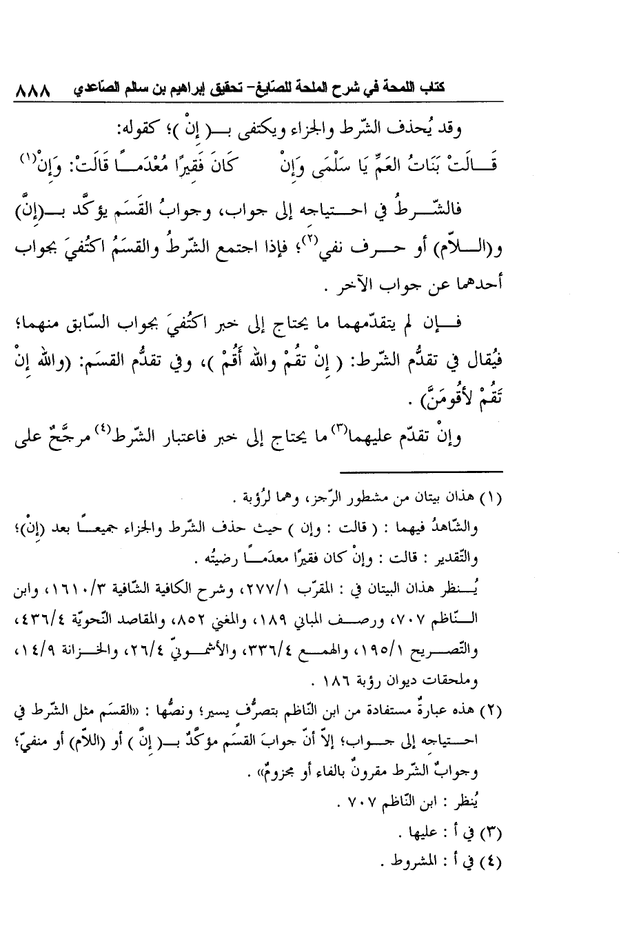 2 هذه عبارةٌ مستفادة من ابن النّاظم بتصرُّفٍ يسير؛ ونصُّها: "القسَم مثل الشّرط في احتياجِه إلى جواب؛ إلاّ أنّ جوابَ القسَم مؤكَّدٌ بـ (إِنَّ) أو (اللاّم) أو منفيّ؛ وجوابٌ الشّرط مقرونٌ بالفاء أو مجزومٌ".