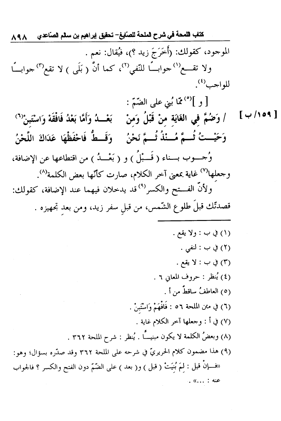 9 هذا مضمون كلام الحريريّ في شرحه على الملحة 362 وقد صدّره بسؤال؛ وهو: "فإنْ قيل: لِمَ بُنِيَتْ (قبل) و (بعد) على الضّمّ دون الفتح والكسر؟ فالجواب عنه: ... ".